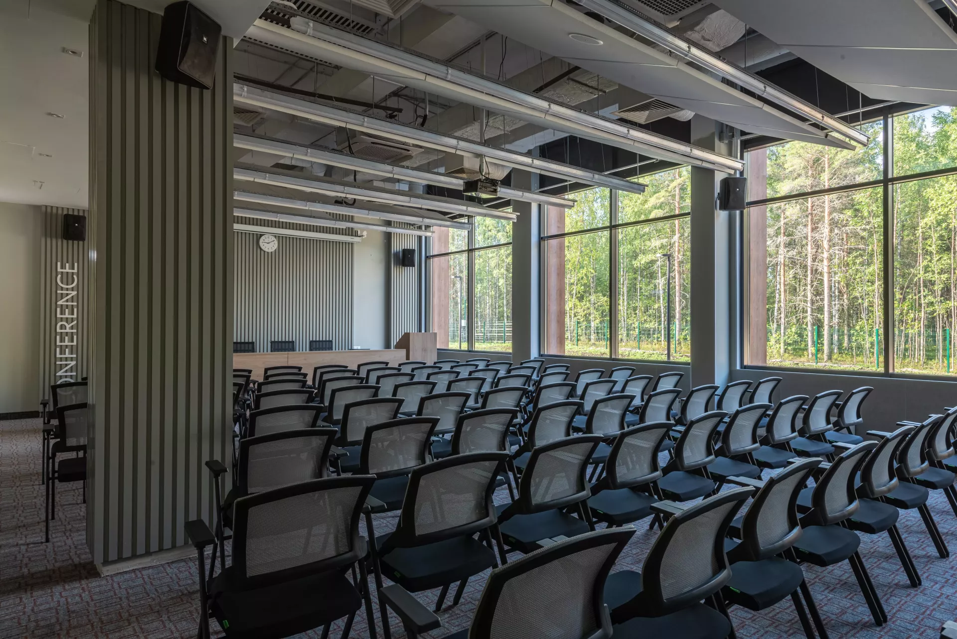 \r\n\r\nПросторный современный конференц-зал идеально подходит\r\nдля конференций, семинаров и форумов. В зале есть рабочий стол для\r\n«президиума», трибуна и беспроводной интернет. Зал оборудован экраном с\r\nпроектором, акустической и микрофонной системой, видеокамерой TrueConf и\r\nноутбуком. Театральная рассадка.