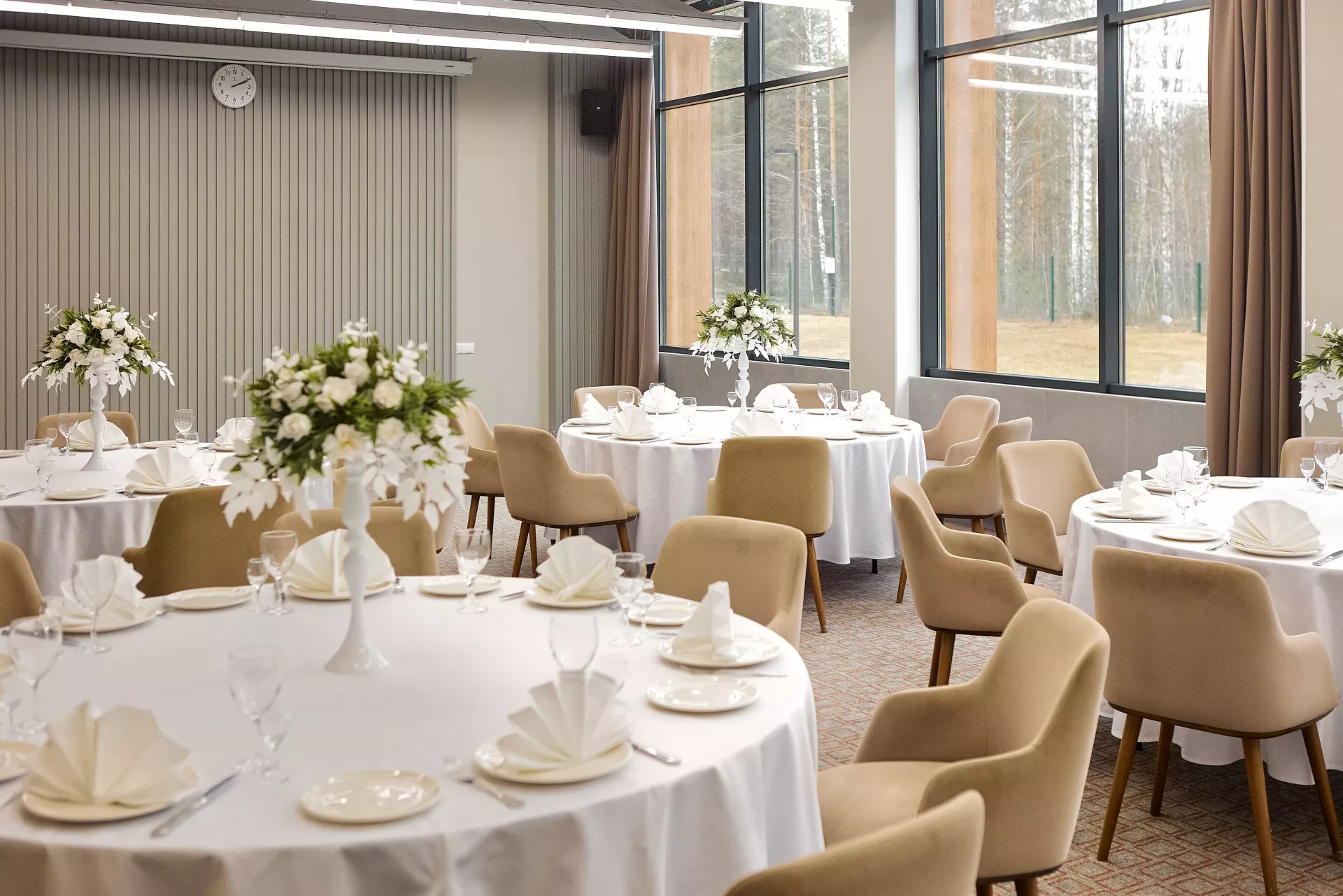 Зал для проведения свадеб, юбилеев, \r\nкорпоративов, детских праздников и других торжественных мероприятий находится на 1 этаже отеля. Живописные панорамные виды на сосновый бор, праздничные блюда \r\nресторана, индивидуальный \r\nподход в обслуживании и внимательный персонал – всё это формула вашего \r\nуспешного события. Специальное банкетное меню основано на карельской кухне в современном прочтении, а также классических блюдах. Особую атмосферу торжества подчеркнёт разнообразная барная карта.